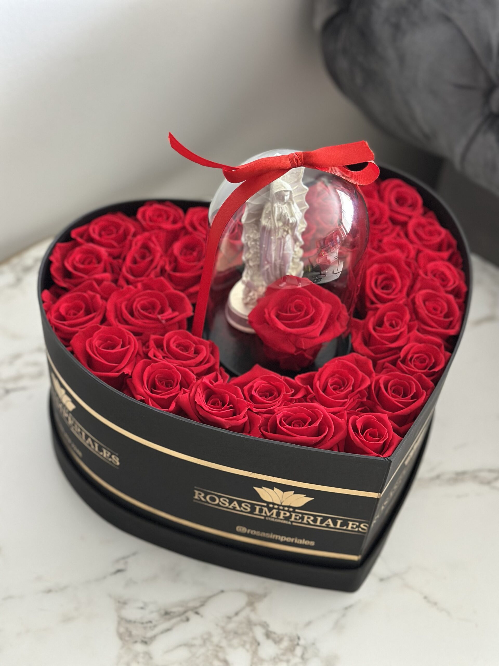 Corazón con rosas preservadas que duran más de 3 años y cúpula pequeña de vidrio con virgen y rosa.